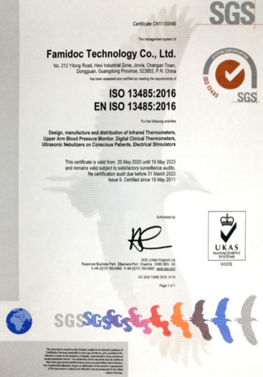 Located in Dongguan City, Famidoc has been dedicated in designing, manufacturing and selling family health and baby care products since its establishment. Our vision is to improve human being life quality by providing affordable, convenient and reliable health care products to more family around the world. Our products include infrared thermometer, arm blood pressure monitor, Tens and EMS stimulator, digital thermometer, electronic abdominal fitness belt. We have got Domestic Class 2 medical devices production license and registration license. We also got ISO 13485 and obtained certificate of CE, Medical Device Single Audit Program, Canada Medical Device License and Australian Register of Therapeutic Goods. Both our raw materials for products and manufacturing process comply with ROHS requirements.