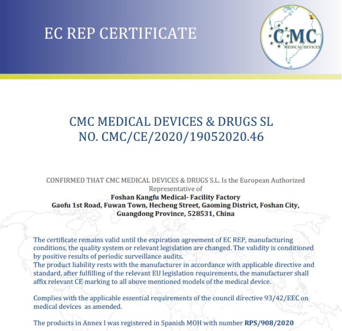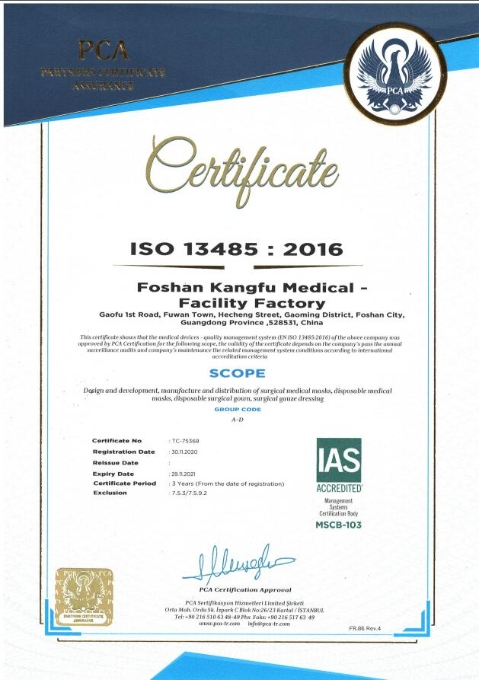 Foshan kangfu medical-facility factory is an enterprise approved and issued production license and product registration certificate by Guangdong food and Drug Administration. Our major products I and II medical instrument. Our factory is equipped with automatic mask production lines, such as mask machine, ear belt machine, double frequency conversion computer controlled rapid packaging machine, etc., with 100000 level purification workshops and 10000 level microorganisms and aseptic laboratory, and a group of engineering and technical personnel to meet the needs of aseptic medical equipment production quality management.